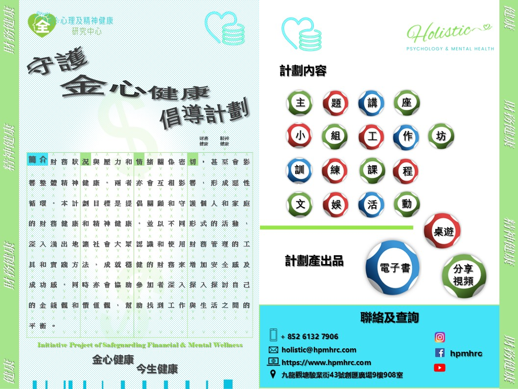 財務狀況與壓力和情緒關係密切,甚至會影響整體精神健康。兩者亦會互相影響,形成惡性循環。本計劃目標是提倡關顧和守護個人和家庭的財務健康和精神健康。並以不同形式的活動,深入淺出地讓社會大眾認識和使用財務管理的工具和實踐方法,成就穩健的財務來增加安全感及成功感。同時亦會協助參加者深入探討自己的金錢觀和價值觀,幫助找到工作與生活之間的平衡。